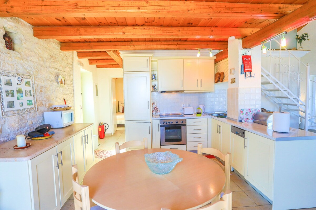 This home is a unique and tranquil getaway, that accommodates a maximum of four people. It retains two en suite bedrooms, with two beds that can turn into double and/or single. A spacious area with a fully equiped kitchen, dining area and living room is also available. Moreover, it has an outdoor swimming pool, relaxing areas and a build-in jacuzzi (outside of the main house). The view of the sea is spectacular, and a moment that no one wishes to miss out on, is the rising sun in the morning !