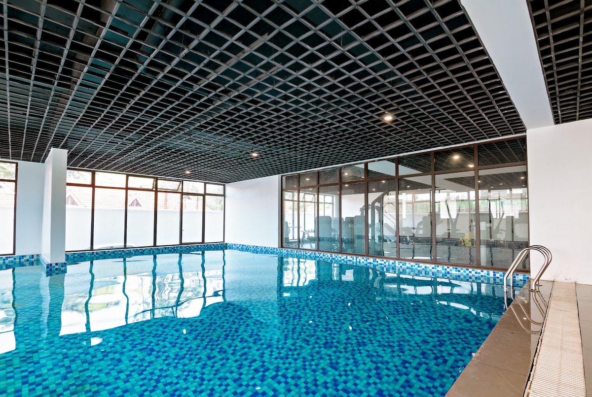 Ett soverom med treningsrom, oppvarmet basseng og utsikt over byen
