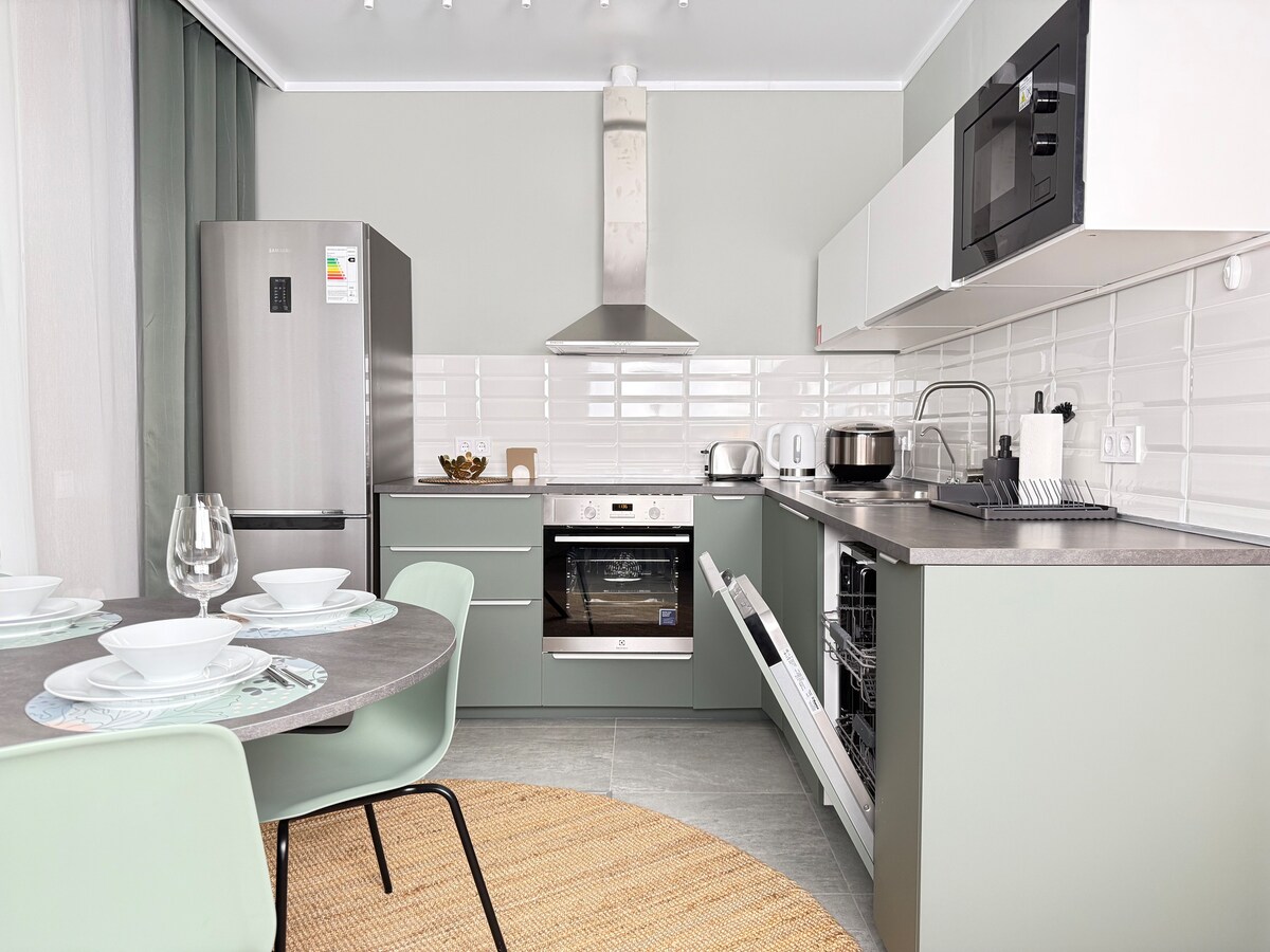 Nyt et stilig opphold i sentrum i den koselige atmosfæren i en ny leilighet med et designinteriør. Boligkomplekset ligger i den øvre delen av byen med utviklet infrastruktur og alle fasiliteter innenfor gangavstand. Forum kjøpesenter, forretningssentre, medisinske fasiliteter, kaféer og restauranter ligger innenfor gangavstand. Boligkomplekset har en dagligvarebutikk, et konditori, skjønnhetssalonger, et apotek og et tøyrenseri – alt du trenger for et komfortabelt opphold. Leiligheten er egnet for en jobbtur og ferie.