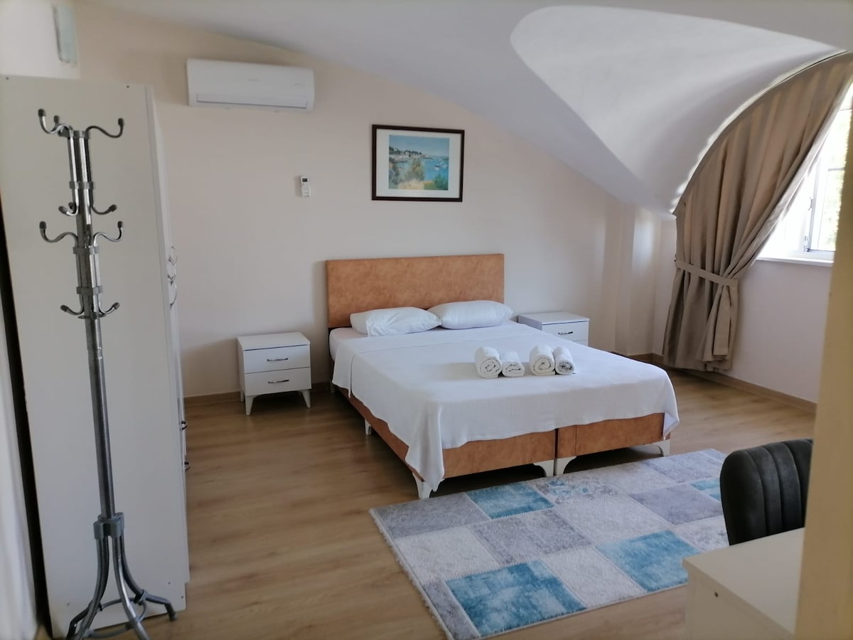 Vårt 2 +1dublex-hus ligger innenfor gangavstand til sjøen, 100 meter til dagligvarebutikken, dagligvarebutikken og bakeriet. Det er 2 soverom og 1 amerikansk kjøkkenstue. Det er to sovesofaer i stuen. Det er klimaanlegg i hvert rom. Husets kapasitet er for 6 personer.🙋♂️ Vårt 2+1 duplekshus ligger i gangavstand fra havet, 100 meter fra markedet,grønnsakshandler og bakeri. Den har to soverom og én stue med amerikansk kjøkken. De to sofaene i stuen blir til senger. Hvert rom har klimaanlegg. Husets kapasitet er seks personer.🙋♂️