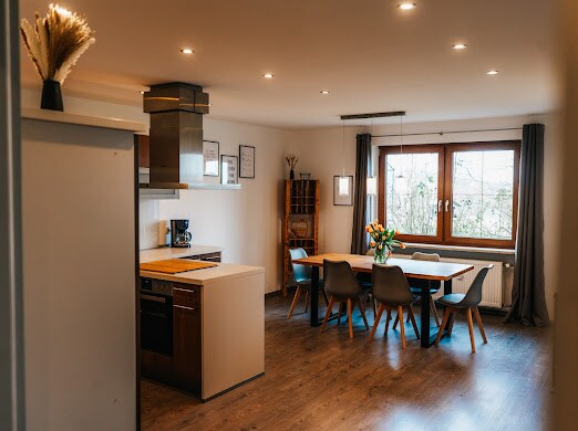 Leiligheten på ca. 55 kvm ligger i første etasje med egen inngang. Utstyrt med walk-in dusj, boxspring-seng 180x200 m, flatskjerm-TV, stor sovesofa for to barn eller 1 voksen, ikke egnet for 4 voksne, elektrisk mørkleggingsrullgardin, samt rask gratis Wi-Fi. Et fullt utstyrt lite kjøkken med alt utstyr du trenger, inkludert en spiseplass for 4 personer. De stilige møblene og fargene inviterer deg til å slappe av og koble av.