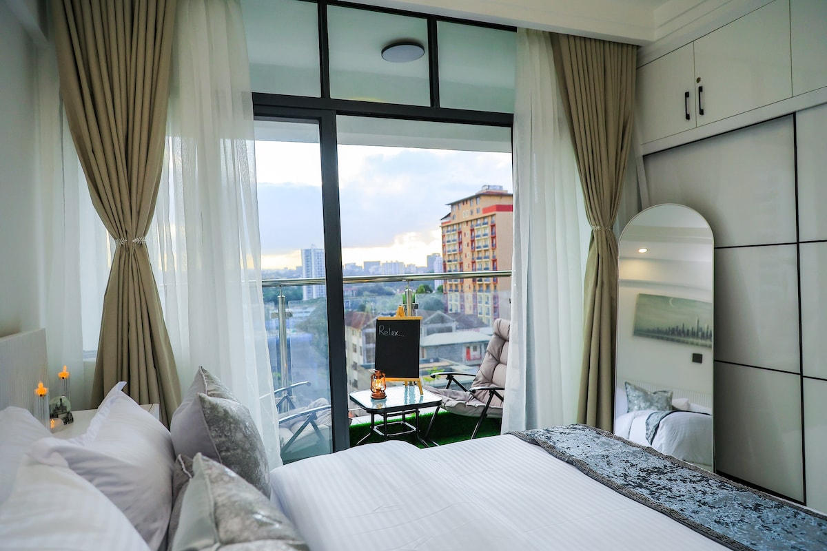 Luksuriøst soverom med eget bad og ekstra gjestebad. Moderne interiør med rikelig med naturlig lys og gulv-til-tak-vinduer som gir fantastisk utsikt over Nairobi. Ligger i Westlands i nærheten av fine spisesteder, shopping og viktige attraksjoner. Inkluderer raskt trådløst nettverk, smart-TV, førsteklasses kjøkkenapparater, sikkerhet døgnet rundt og concierge-tjenester. Enten det er for fritid eller jobb, har denne leiligheten den perfekte balansen mellom luksus og tilgjengelighet.
