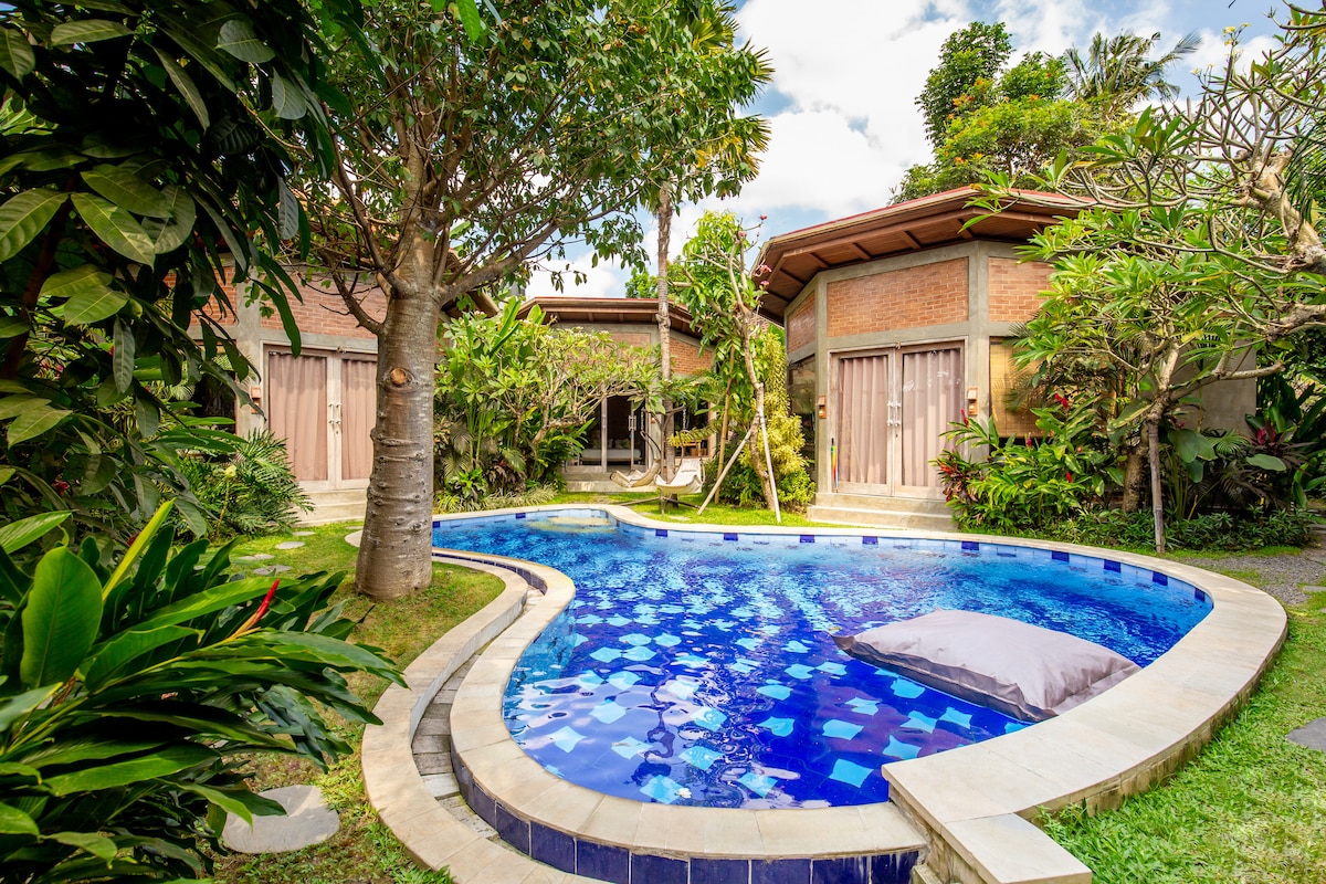 En privat villa med basseng i tre, privat kjøkken og klimaanlegg. Trådløst nettverk er tilgjengelig. Flott sted for familie eller gruppe på fire. Også perfekt avsidesliggende sted for reisende mens de jobber hjemmefra. Feriestedstjeneste er tilgjengelig, for eksempel frokost, lunsj, middag på restauranten på stedet, med gratis tilgang til Umadhatu Waterpark hver dag. Vaskeritjeneste er tilgjengelig. Turskranke og transport er tilgjengelig basert på gitt informasjon fra resepsjonen.