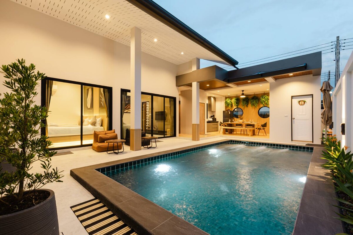 Denne private bassengvillaen ligger bare 800 meter fra Klong Mueang-stranden, er omgitt av frodige gummitrær og fredelig natur. Perfekt for 2–4 gjester, og tilbyr romslige soverom, en koselig stue, et fullt kjøkken og et forfriskende basseng – ideelt for å slappe av etter en dag på stranden. Nyt en tropisk ferie hvor naturen møter komfort, bare noen minutter fra Krabis vakre kystlinje.