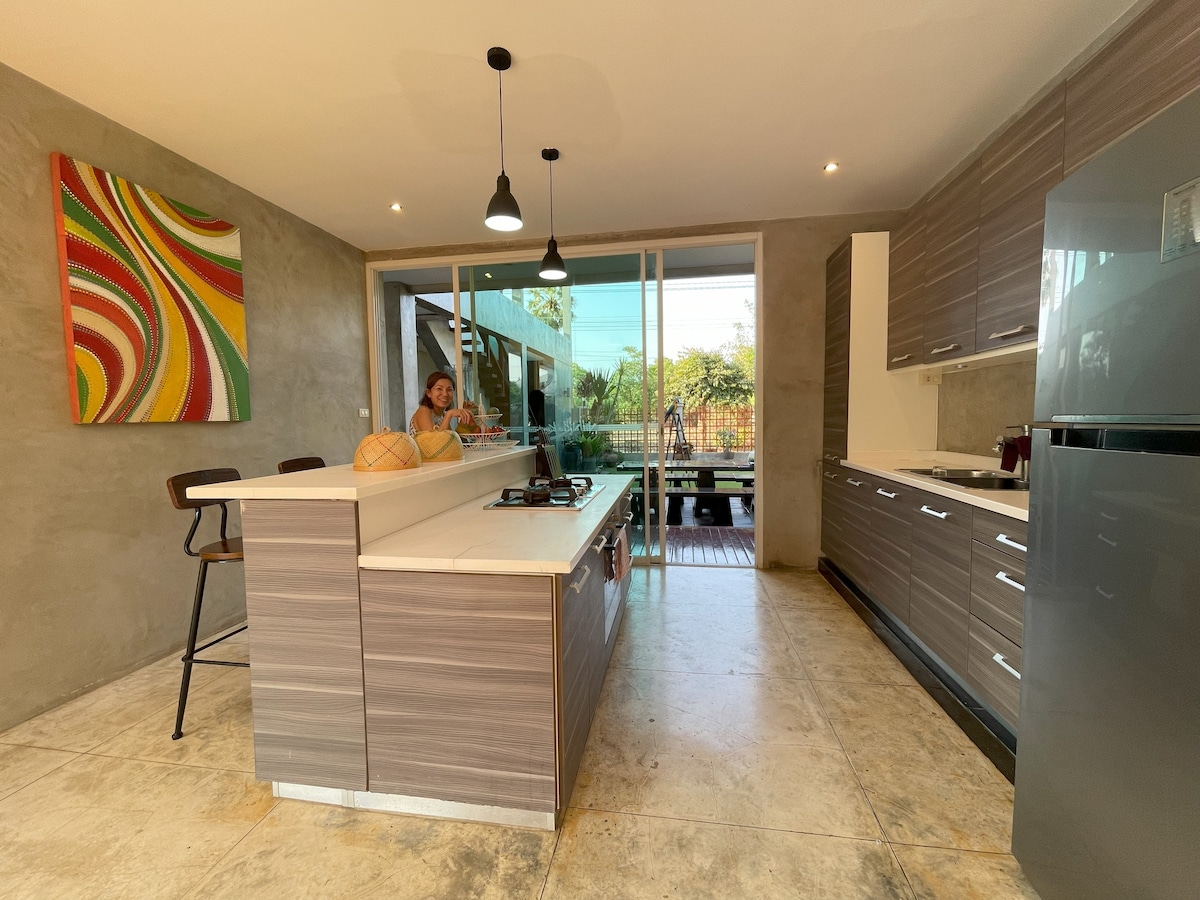 Flykt fra byen og slapp av i denne fredelige villaen med tre soverom og basseng, bare minutter fra Pranburi-stranden. Areeya Retreat tilbyr et privat basseng, biljardbord, fullt utstyrt kjøkken og en lys, naturlig opplyst stue – perfekt for å slappe av eller jobbe eksternt med raskt trådløst nettverk. Omgitt av åkre og bare 1,3 km fra strandveien, er det ideelt for familier, grupper eller par som ser etter komfort og ro. Få 15–30 % rabatt for ukes- og månedslange opphold.