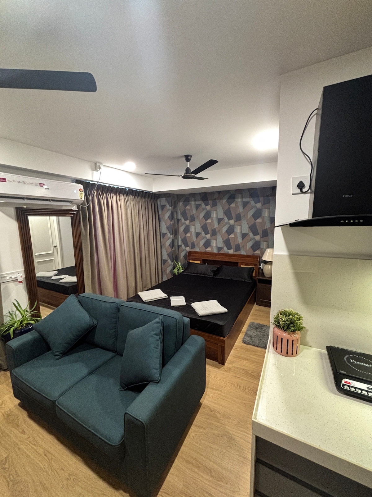 Skap minner på dette unike og familievennlige stedet. Skap minner i denne unike og familievennlige studioleiligheten i StayBird Azure Suites. Nyt moderne bekvemmeligheter som klimaanlegg, trådløst nettverk, smart-TV og et eget bad i rene og trygge omgivelser. Perfekt for jobbreiser, familiebesøk eller byferier. Ligger i Kharadi med spisesteder, shopping og transport rett utenfor døren. Slapp av, jobb eller utforsk med letthet i ditt koselige hjem hjemmefra. Administrert av StayBird Hotels