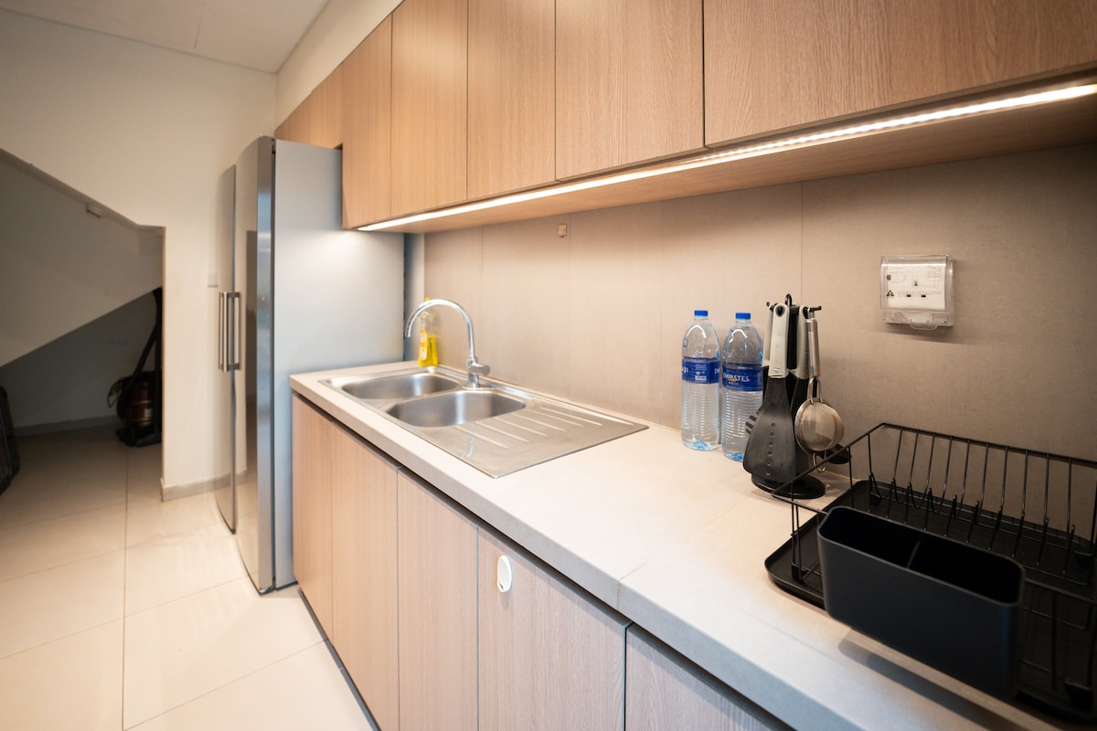Leiligheten min har ett rom med en kingsize-seng for to personer, og et rom med en dobbeltseng for to personer, og ett lite rom med en liten seng for én person. Alle rommene har et bad, og ett bad er tilgjengelig i stuen, som har komfortable sofaer. I tillegg er et spiskammer tilgjengelig med alt nødvendig utstyr for matlaging og servering. Leiligheten min er en del av The Adress Fujairah Hotel, Alaqah. Leiligheten min ligger i første etasje, hvor du kan nyte balkongen.