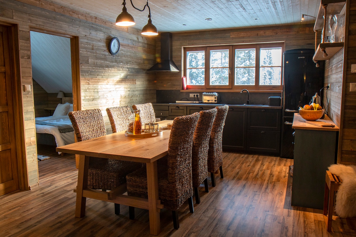 Slapp av i denne rolige innkvarteringen. Her bor du i et eksklusivt, nybygd tømmerhus ved siden av Torne elg. Boligen ligger på to etasjer og består av kjøkken, stort bad, stor stue, to soverom, smart-TV, skotørker, stor terrasse både i nedre og øvre etasje,terrasse ved elven. Fantastisk utsikt over Torne-elven hvor du ser en blanding av NORDLYS, scootere, hundeløyper og vinterbad. Det er tilgjengelig for å bestille en vedfyrt sauna og grillplass, mot et gebyr. Gangavstand til Icehotel, hjembyfarmen, kirken og bedriftsparkering utenfor døren.