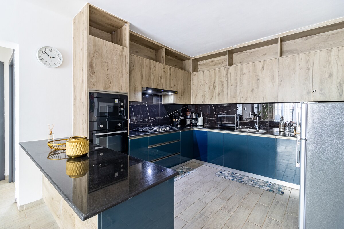 En rolig, elegant ferie i hjertet av Kilimani. Denne gjennomtenkte leiligheten blander varme jordfarger, myk belysning og naturlige teksturer for å skape et koselig, moderne opphold. Slapp av i den solfylte stuen med rustfarget sofa og kuratert kunst, nyt måltider i den elegante spisestuen, eller lag mat i det fullt utstyrte kjøkkenet. Slapp av på et rolig soverom om kvelden. Perfekt for enslige reisende, par eller familier som ønsker komfort, stil og bekvemmelighet.