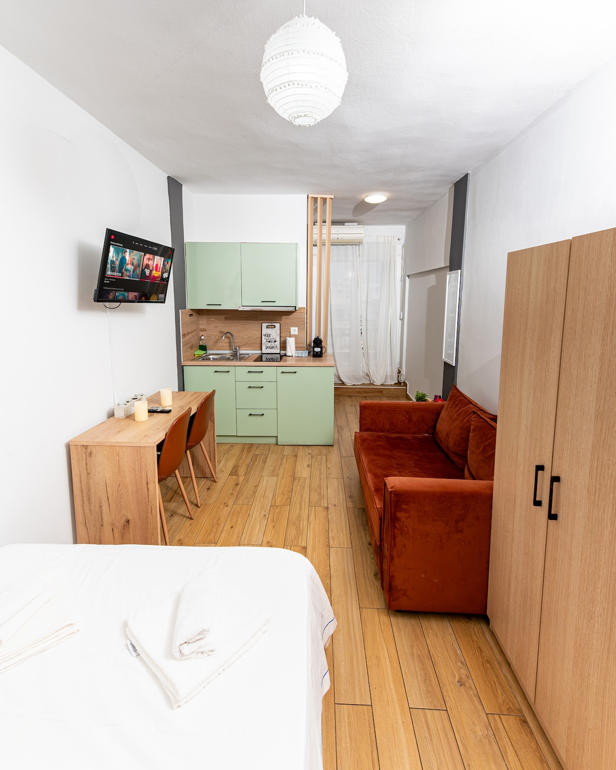 Unik 1 soverom fullt utstyrt leilighet i syvende etasje i en 2020 renovert bygning med en fantastisk terrasse balkong. Trådløst nettverk med høy hastighet, førsteklasses fasiliteter, en luksuriøs queensize-seng og din egen Netflix-konto er bare noen få ting vi tilbyr deg. Lysende, romslig, med alt du trenger for å nyte ditt opphold i hjertet av Thessalonikis sosiale liv, bare 5 minutter fra Aristoteles-torget og 2 minutter fra strandpromenaden. Velkommen og kos deg under oppholdet ditt!