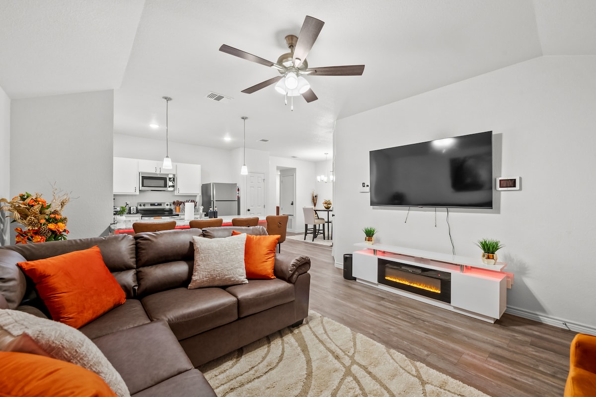 Moderne 3BR/2BA smart hjem i rolige Killeen, bare minutter fra Fort Cavazos, restauranter, shopping og familieaktiviteter. Plass til åtte personer med kingsize-seng, queensize-seng, to enkeltsenger og en sovesofa. Alexa-drevet smart teknologi styrer lys, klimaanlegg og underholdning overalt. Har kjøkken i marmor, apparater i rustfritt stål, raskt trådløst nettverk, TV-er i flere rom og en koselig peis. Bakgården har en pergola med sitteplasser, en bålpanne, en bar, hagespill og husker, perfekt for familier eller forretningsopphold.