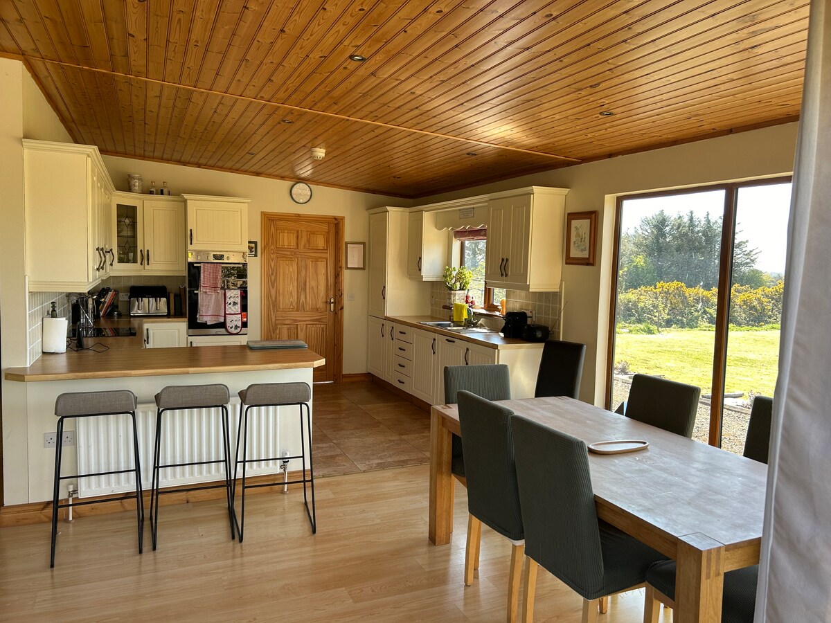 Tinnaberna View: Beautiful bungalow on a very spacious site with picturesque countryside views all around. Very sunny patio and living room / kitchen area with sea view. 15 minutes walk to Tinnabearna Beach, very quiet road. The house is very warm, built with the newest energy standards. We have fast unlimited Internet and a big LG SmartTV (65"). Weekly bookings only in July & August.