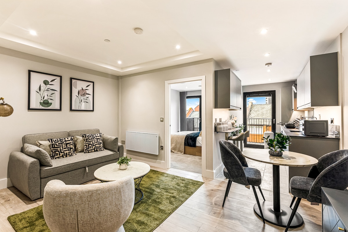 Luksuriøst tilfluktssted på løvrike New Walk med panoramautsikt over Museum Square fra salongen og kingsize-sengen gjennom skyvevinduer. Kaffemaskin og fullt utstyrt kjøkken – egnet til å lage en full engelsk eller stekt middag – nytes ved frokostbaren eller spisebordet. Nyt en 65 tommers 4K-TV med Netflix. Dra nytte av myk belysning og en kraftig dusj. Bare fem minutter fra stasjonen, gå til De Montfort Hall 10, Curve 8 og Tigers Stadium 12 minutter. Et rolig, stilig tilfluktssted rett ved Leicesters perle, New Walk. 🍃