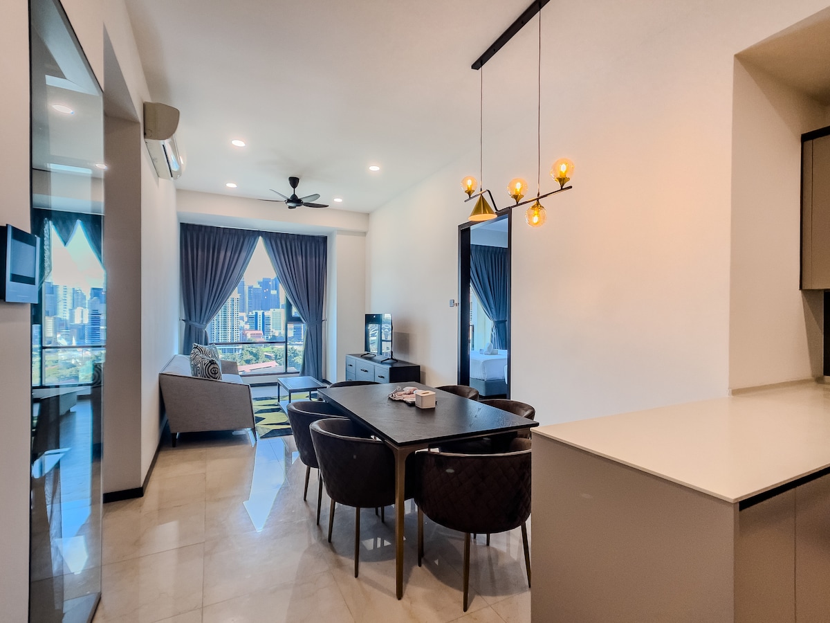 Len deg tilbake og slapp av på dette rolige, stilige stedet. Why Orchid 2BR suite at Lucentia Residence: - Den beste utsikten over KL – Vakkert dekorert med en morsom atmosfære. – Sentralt beliggende og tilknyttet offentlig transportknutepunkt. - raskt trådløst nettverk. - 2 TV med Netflix og andre - to nydelige bassenger - Familievennlig med barneseng og barnestol. – Treningsstudio, biljardbord, grillgroper, piano. - Garasjeparkering – Anbefales for fem personer, maks seks. - LaLaPort kjøpesenter og WOW-UNDERHOLDNINGSGATEN er tilknyttet. – Dagligvarebutikk, apotek og kino osv.