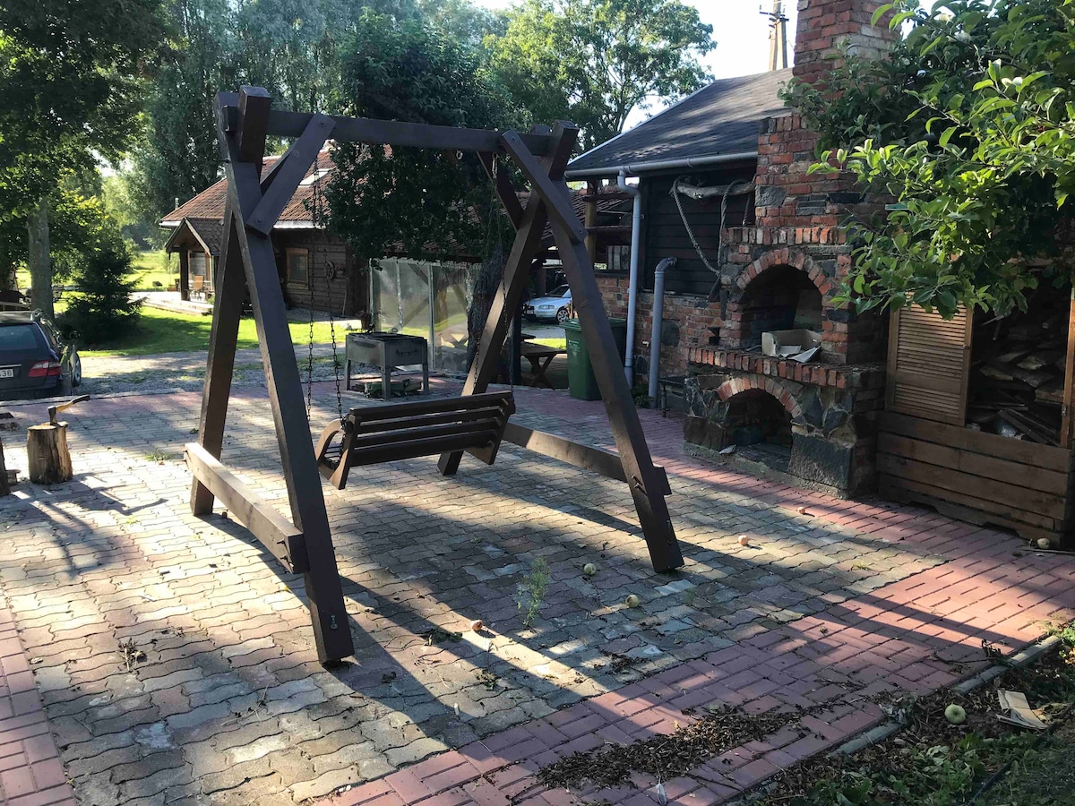 Hele gården bare for deg! Badestamp, romslig badstue, 12 sengeplasser (det er også mulig å organisere flere sengeplasser), stor utendørsterrasse, hage og mye privatliv. På eiendommens område finnes også en autentisk gammel gård bygget i 1937, som pryder eiendommens område. Vi har også et festlokale som heter «Daržinė». Du finner oss også på FB (gårdshuset Viltis) Gården ligger i en enkeltgård i landsbyen Bikavėnai. I nærheten er elven Jūra.