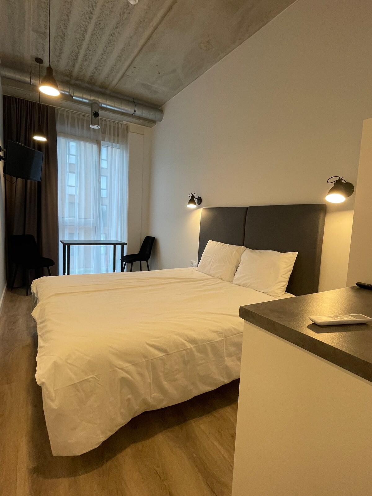 Vi tilbyr nybygd Loftsleilighet med 4 meter vinduer og nesten 5 meter tak. Den har industriell, men likevel luksuriøs stemning. Med helt nytt komplett kjøkken, king size-seng vil det være komfortabelt å tilbringe tiden din i Klaipeda. Det ligger også ved siden av gamlebyen, så det er perfekt for folk som liker å nå de vakreste stedene i byen raskt.
