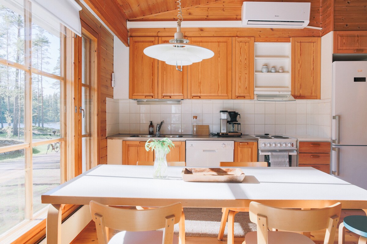 Denne koselige hytta ønsker deg velkommen til å tilbringe avslappende ferier og lengre opphold med fjernarbeid midt i vakker og fredelig finsk natur. Hytta har to romslige hytter, et velutstyrt kjøkken og en god badstue. Den sjarmerende badevannet ligger bare noen få skritt og trapper unna hytta. Det er godt trådløst nettverk, en stor, solrik plen og ingen naboer i sikte – slik at du kan svømme i bursdagssuiten din hvis du vil. Den nærmeste dagligvarebutikken ligger 12 minutter unna.