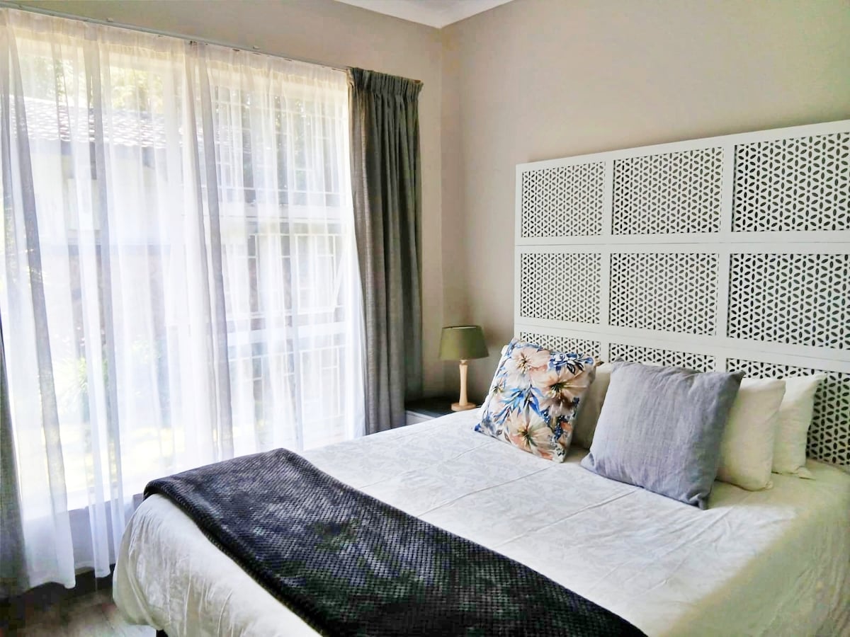 En utsøkt selvbetjent enhet en av 6 lignende enheter i gjestehuset. Egnet for lengre opphold eller et dagsbesøk. Veldig godt plassert 1,2 km fra alle sykehusene (Sunningdale, Ancron og Wilmed) og 200 meter fra åtte forskjellige restauranter. Døren som fører til en vakker gangvei i øverste etasje og nede er en frodig hage og braai-område. Rolig hage med 60 år gamle trær