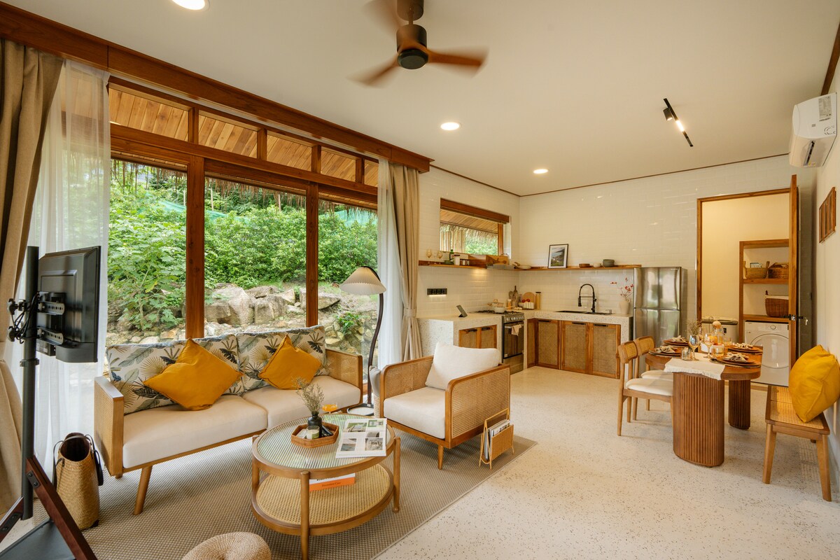 Denne «bryllupsreise-bungalowen» i Bali-stil tilbyr dramatisk 180° havutsikt og ligger isolert i enden av en privat vei med utsikt over havet. Kos deg med superraskt fiberoptisk mesh-WiFi! Den er valgt som en av AirBnBs Secret Gems, og har vært vertskap for gjester og kjendiser fra hele verden. De to sammenkoblede soverommene er mest komfortable for romantiske par eller familier med to barn, men har plass til opptil fire voksne.