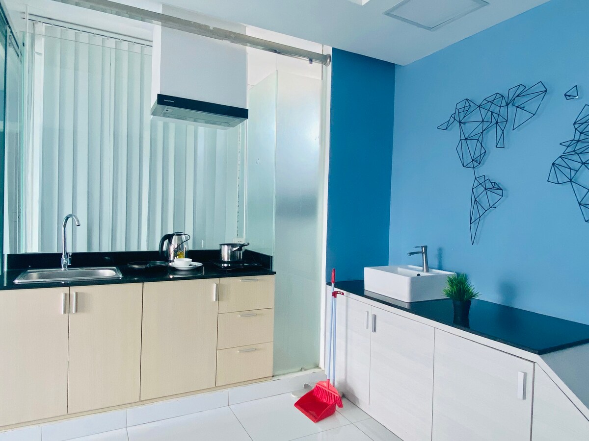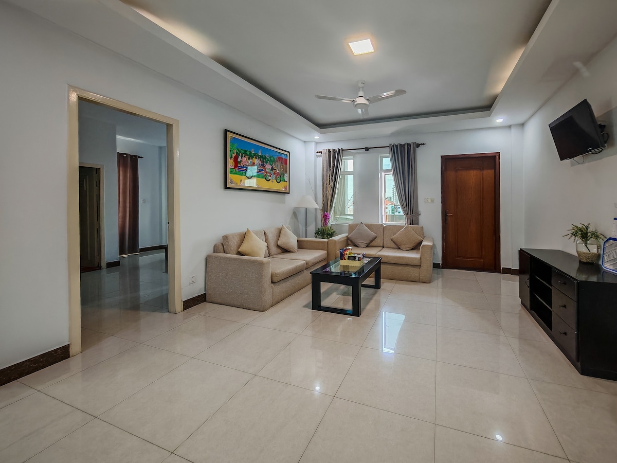 Romslig kingsize-seng/ privat bad/ separat stue og kjøkken med basisartikler/balkong med utsikt over byen eller takterrasse/ heis/ sikkerhet døgnet rundt/ Ukentlig romservice/ vaskemaskin/ klimaanlegg/gratis trådløst nettverk/ parkering på stedet osv. Vi ønsker å få deg til å føle deg som hjemme! Denne leiligheten ligger sentralt i Phnom Penh, ca. 1 km til det olympiske nasjonalstadionet og Tuol Sleng folkemordsmuseum, 2 km til Det russiske markedet og det sentrale markedet, 3,5 km til kongeslottet, nasjonalmuseet, Wat Phnom og The Riverside.