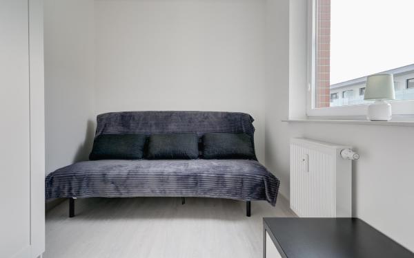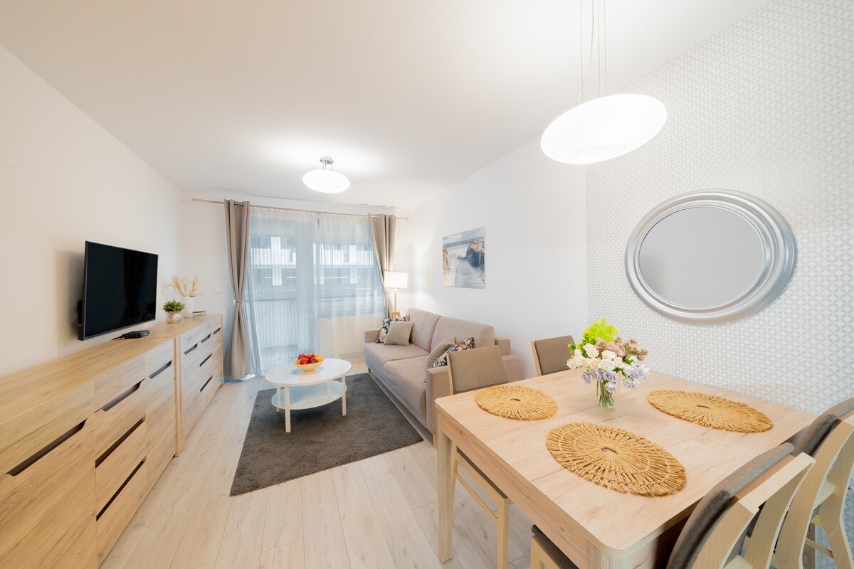 Apartment Wave er en romslig og moderne leilighet i et prestisjetungt område. Bare noen få skritt etter en spasertur, vil gjestene finne seg selv i en havn, fyrtårn, brygge, boulevard, strand eller surfeskole. I bygningen tilbyr vi et innendørs basseng med et padlebasseng for barn, en sauna, et bad og en jacuzzi. De yngste gjestene vil finne aktiviteter i lekerommet og voksne i et velutstyrt treningsrom med utsikt over parken. Om sommeren er det også utsiktsterrasser og utendørsbasseng.