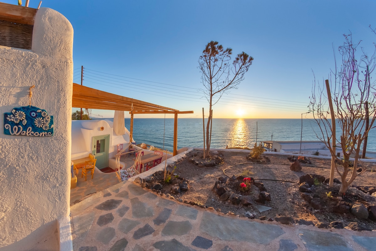 Welcome dear traveler to the Window towards Sunrise! It is one of the houses in Cybele Holistic Space located between Fira and Oia and is situated just one minute walking distance from Pori beach, where you can easily enjoy a swim any time you want. It consists of two floors and from the upper floor you can literally enjoy the sunrise, if an early bird! The house has been renovated very recently, combining traditional cycladic architecture with our personal designs and love !