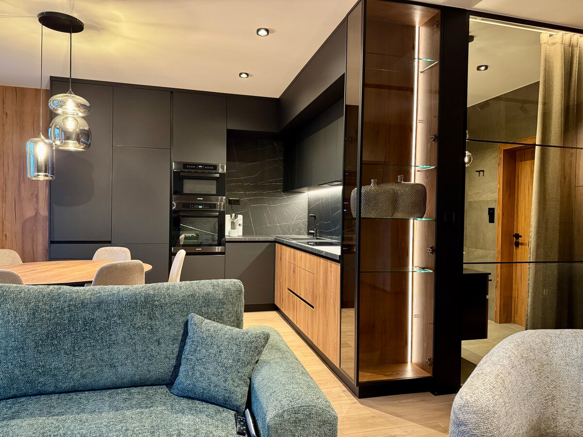 Dette unike overnattingsstedet har en egen stil. Leiligheten er fullt møblert og utstyrt med et komplett kjøkken med grill og et stort kjøleskap, oppvaskmaskin og vaskemaskin, så den er også egnet for lengre opphold, det er også en liten sauna for to personer. Et trygt rom for sykler er også tilgjengelig i kjelleren. Leiligheten har klimaanlegg og har også fiber internettilgang.