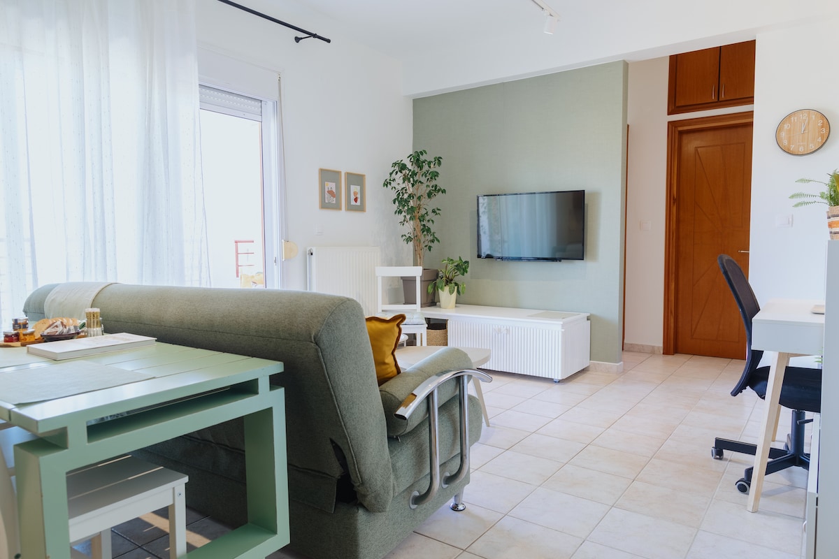 Leilighet på 70 kvm med to soverom i sentrum, 3 minutter fra gågaten i Venizelou-gaten, 5 minutter fra sentrumstorget. Den ligger i en privilegert posisjon, 10 minutter fra Kosmopolis kjøpesenter og 5 minutter fra studentbussholdeplassen. Romslig, ideelt for familier og vennegjenger. Leiligheten har et utstyrt kjøkken, kaffetrakter, vannkoker, vaskemaskin, tørkestativ, strykejern, hårføner. 24-timers innsjekking tilbys og mulighet for å forlenge utsjekkingen uten kostnad.