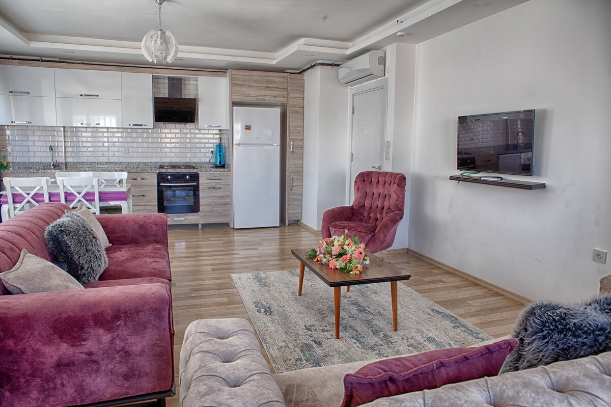 Denne leiligheten ligger i sentrum av Konyaaltı-distriktet og har ett soverom, én stue, ett kjøkken, ett bad og en balkong. Det er klimaanlegg på soverommet og i stuen. Leiligheten vår har en kombikjele og varmt vann døgnet rundt. Vaskemaskin, oppvaskmaskin, komfyr, stekeovn, hette, mikrobølgeovn, kombikjele, brødrister, hårføner, filterkaffemaskin, tyrkisk kaffemaskin, vannkoker og to smart-TV-er står til tjeneste for gjestene våre.