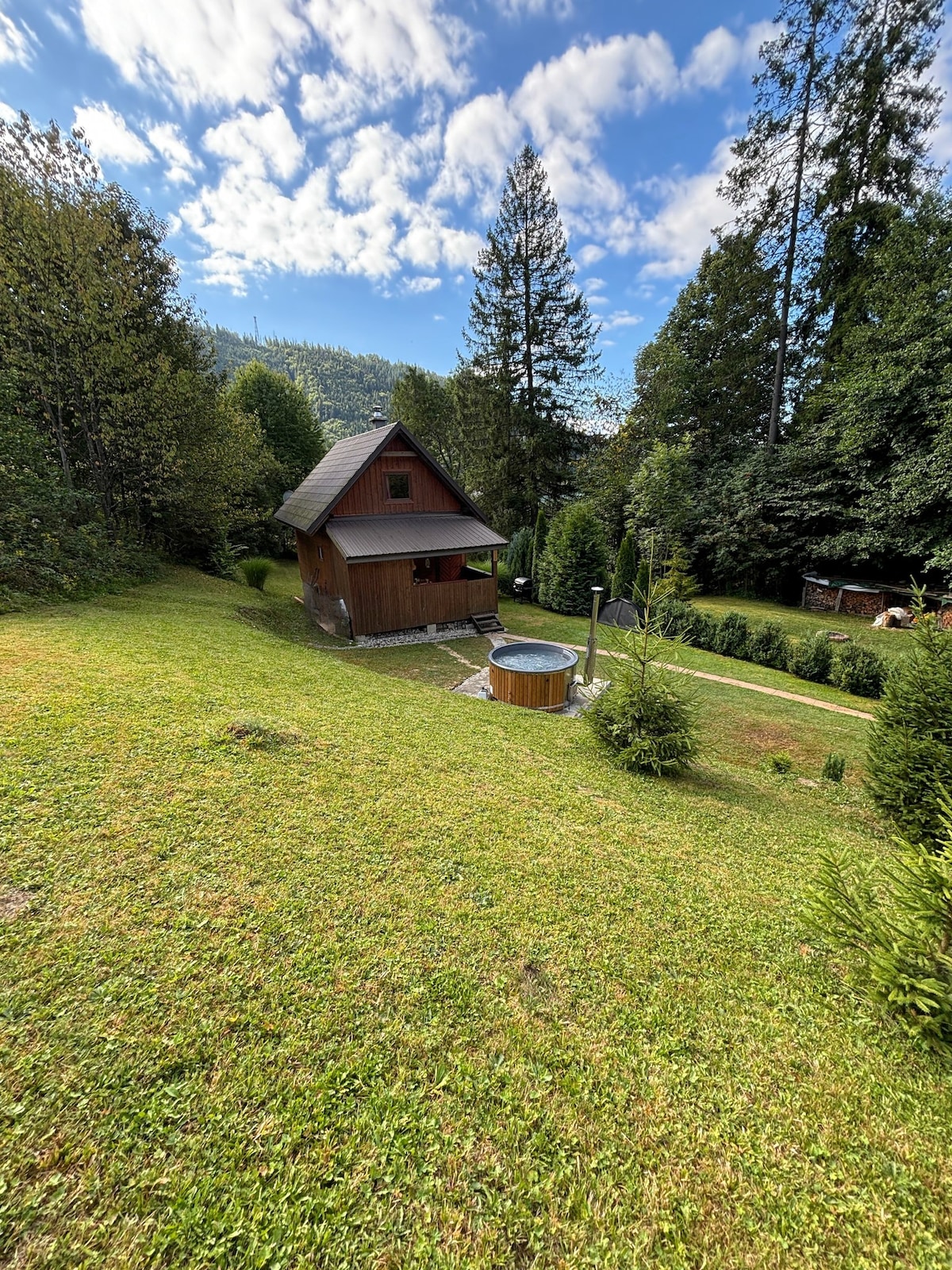 Trehytte i vakker natur med boblebad