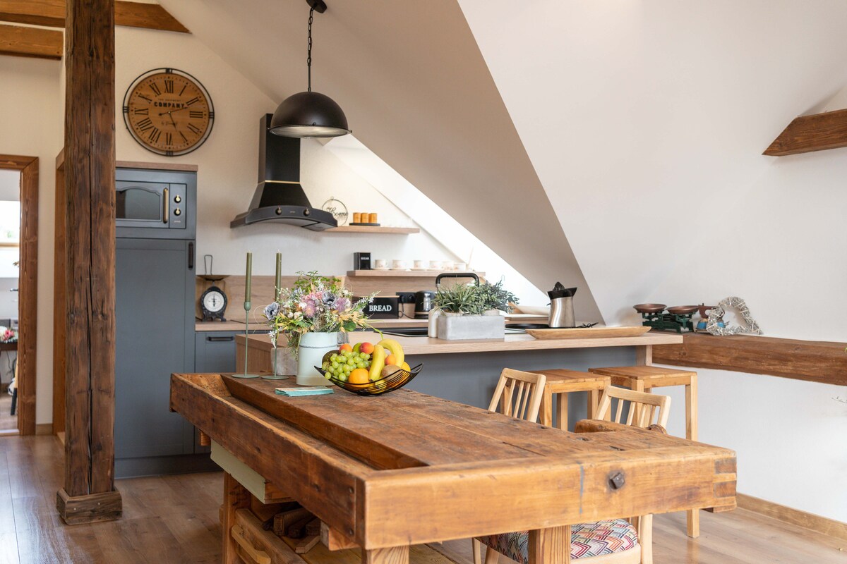 Du finner leiligheten vår på loftet. Inneholder: Stue med sofa, sofabord, TV og peis. Den har to separate soverom. Dobbeltseng 1800/2000 og seng 1400/2000. Kjøkkenet har et fullt utstyrt, moderne tekjøkken. med kjøleskap, komfyr, varmluftsovn, mikrobølgeovn, vannkoker, kaffemaskin, oppvaskmaskin og atypisk spisebord. Badet har badekar, dusj og toalett. Det er et separat rom til et hjemmekontor i leiligheten.