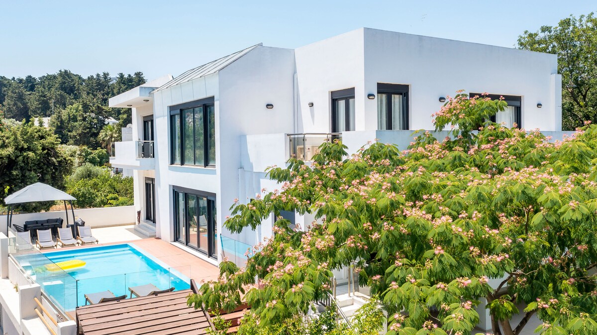 Ny moderne villa med 160 kvm bygget område i unik beliggenhet, privat basseng. Villa med fire soverom og privat basseng i den pittoreske landsbyen Koskinou. 17 km fra flyplassen og 9 km fra Rhodos by. Vakre strender som Kalithea eller Faliraki ligger innenfor ti minutter med bil. Her kan du nyte en komfortabel og fredelig ferie med familien din. Den ligger like under Koskinou-landsbyen, omgitt av skogstrær som gir skygge om sommeren, men ikke skjuler utsikten til sjøen.