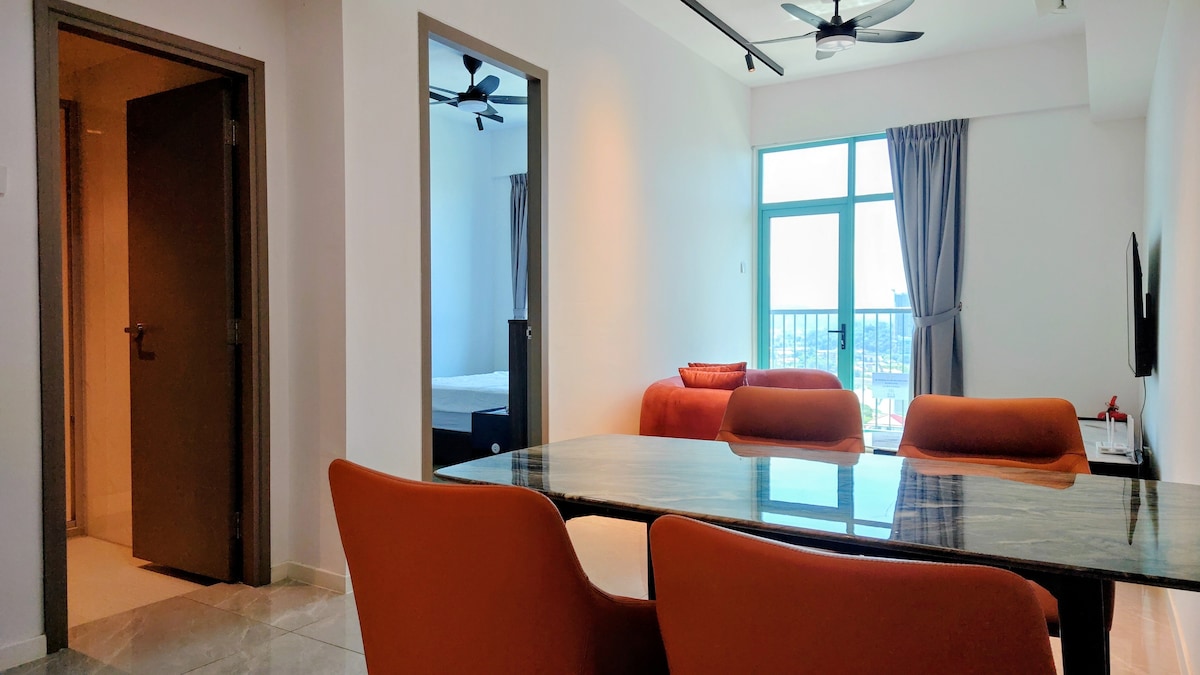 💡 For safety reasons, iron is not provided, but a garment steamer is available upon request 🌅 High‑floor 22F unit with balcony views of bay & Mount Kinabalu 🛏️ 2 bedrooms, each with a King bed 🚿 2 bathrooms for convenience 🛋️ Living room with sofa & flat‑screen TV 🍽️ Dining table for 4, kitchenette with cookware & utensils ⚡ High‑speed WiFi, modern furnishings, spacious layout