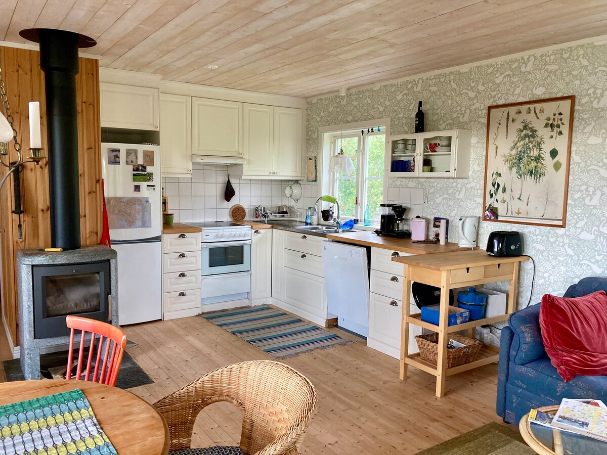 Denne sjarmerende hytta ligger på en øy, med stue med utsikt over elvemunningen. Det er sovemuligheter for fem personer: ett soverom med en seng og et loft med tre komfortable sengemadrasser. Det er ett bad og et fullt utstyrt kjøkken. Det er også vaskemaskin på hytta. Dette er et perfekt sted å slappe av og nyte den rike naturen som øya gir. Utforsk det til fots eller på sykkel.