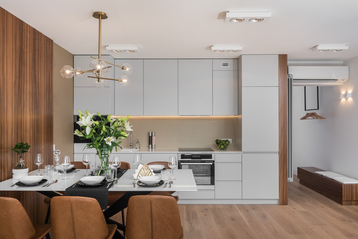 Beundre den elegante stemningen i en byleilighet med paneler og pleksiglass