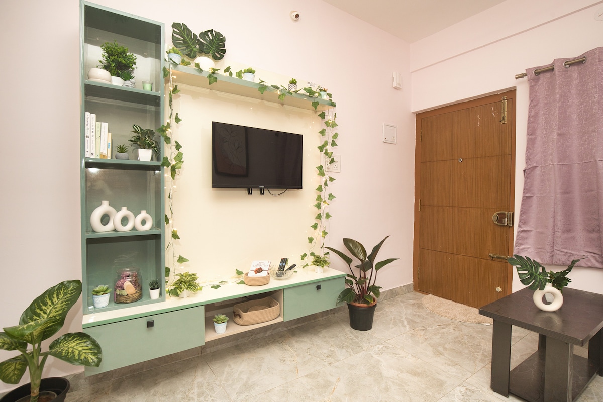 Denne gjennomtenkte leiligheten i boho-stil med ett soverom i Hoodi i Bengaluru er ideell for forretningsreisende, IT-fagfolk, konsulenter og gjester på langvarige opphold. Stedet er innredet med jordnære toner og beroligende plantedekor, og det tilbyr et fredelig, arbeidsvennlig miljø med pålitelig tilkobling. Leiligheten ligger i nærheten av Whitefield IT Hub og bare 20 minutter fra T-banen, og den gir enkel tilgang til kontorer og forretningsparker som er perfekte for lengre arbeidsoppgaver. Det er et kjæledyrvennlig miljø.