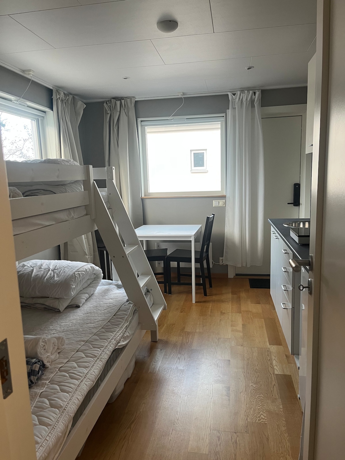 Fräsch övernattningslägenhet med 2st familjesängar i kombinerat sov/vardagsrum, dvs man kan bo fler än fyra. Badrum med golvvärme. ett större kombinerat mat och allrum som inrymmer kök med frys, kyl, spishäll. lämpligt stort köksbord som även fungerar som arbetsbord vid kontorsarbete. Sängkläder och handdukar ingår. kodlås för kontaktfri in och utcheckning vid behov, annars visar vi gärna. För skotergäster eller mc-gäster finns möjlighet att parkera inomhus i låst varmgarage i samma byggnad.
