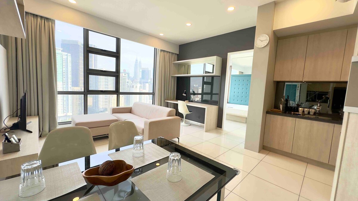 Velkommen til mitt eksklusive, men praktiske hjem i KLCC! Denne elegante leiligheten med to soverom og to bad har en fantastisk utsikt over de ikoniske Twin Towers fra hovedsoverommet og fra det avslappende badekaret på badet. Leiligheten er godt møblert med en romslig stue og et fullt utstyrt kjøkken. Du vil også være innenfor gangavstand til populære kjøpesentre (som Pavilion, KLCC osv.), restauranter, kafeer, og det beste er at Conlay MRT2-stasjonen ligger bare et steinkast unna.