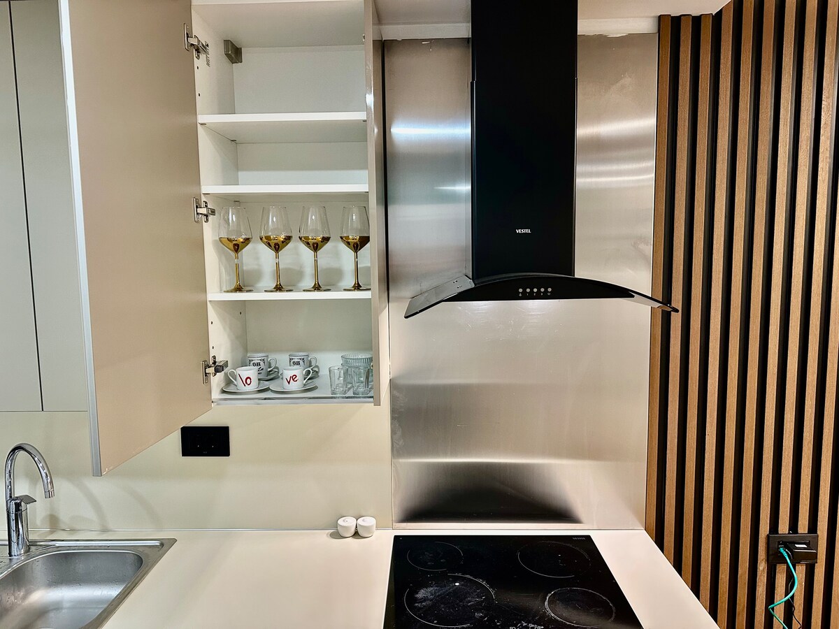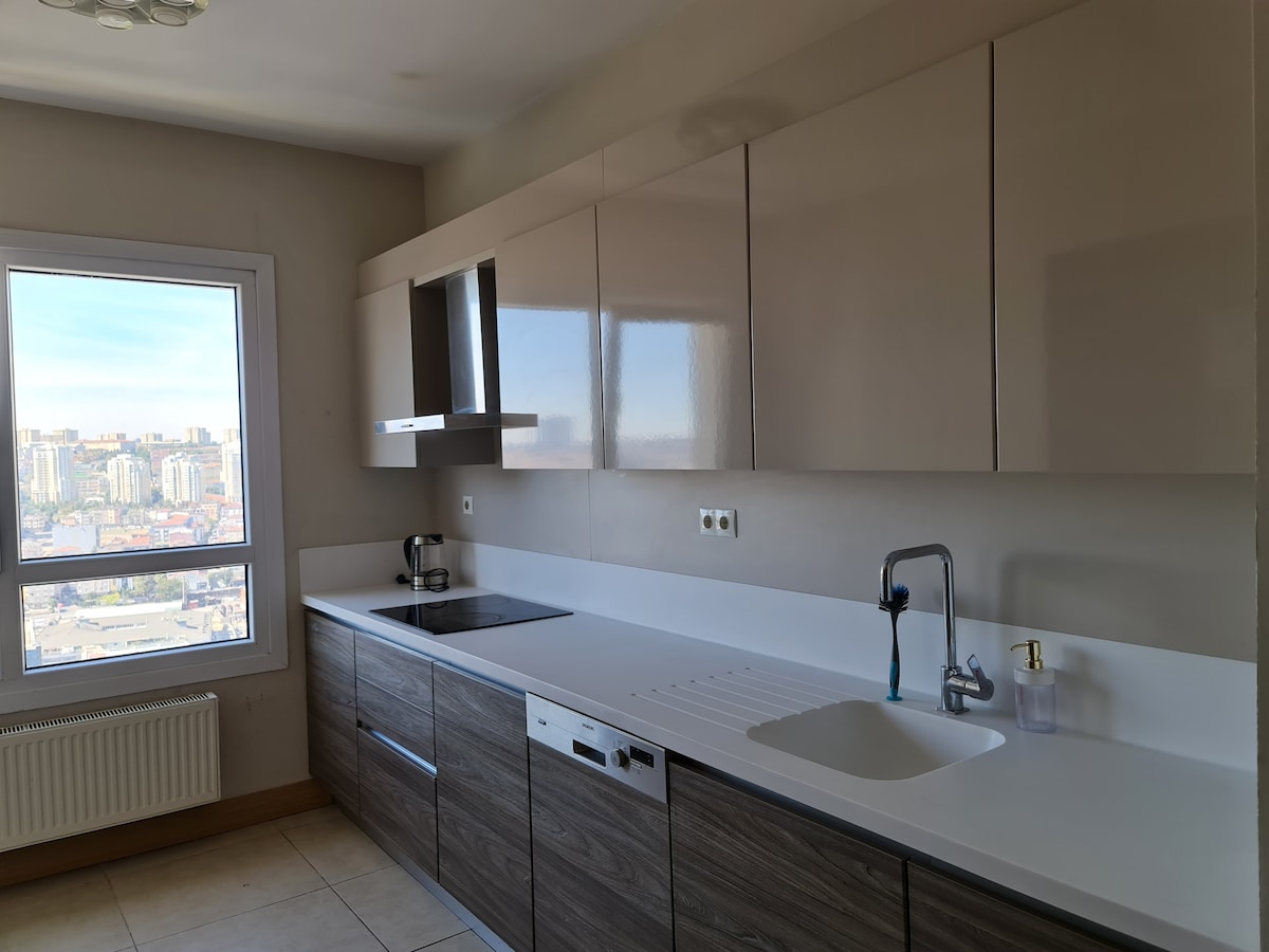 Nyt et fredelig og komfortabelt opphold i et stilig og moderne hjem med fantastisk utsikt over byen. Det er det perfekte stedet å slappe av og slappe av vekk fra byens mas. Det ligger også i nærheten av butikker og restauranter, og bare 700 meter fra det nye Tema World Mall, som har mange restauranter, kafeer og klesmerker. Det er også 3 km unna Marmaray T-banestasjon, Halkalı, som lar deg reise gjennom hele Istanbul, selv til den asiatiske siden.