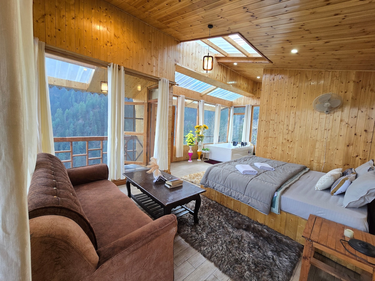 Beautiful Wooden Jacuzzi Glass House with valley views, centrally located near the market, popular cafés, and waterfall — perfect for a peaceful getaway. # Spacious Master Bedroom # Private Jacuzzi with Valley View # Power Backup # Free Wi-Fi # Bonfire Area # In-House Food Service # Surrounded by Nature # Free Parking Space Please Note: -There is 50mtrs Walk from the parking spot to the property. we will pick your luggage. Breakfast, meals,room heaters, bonfire exclusive of stay price here