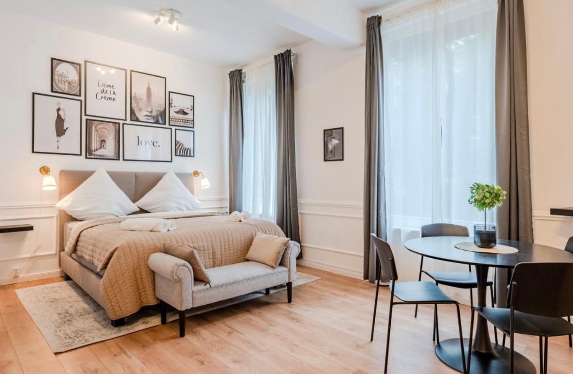 Alle leilighetene våre ligger i Prenzlauer Berg, et vakkert nabolag hvor du finner små butikker, restauranter, barer og «Mauerpark». Leilighetene med ett soverom i denne kategorien har plass til opptil tre personer. Soverommet har en dobbel queensize-seng (160 × 200), en komfortabel sammenleggbar seng kan settes inn i stuen eller soverommet. Vi tilbyr et fullt utstyrt kjøkken, et bad med badekar og dusjslange.
