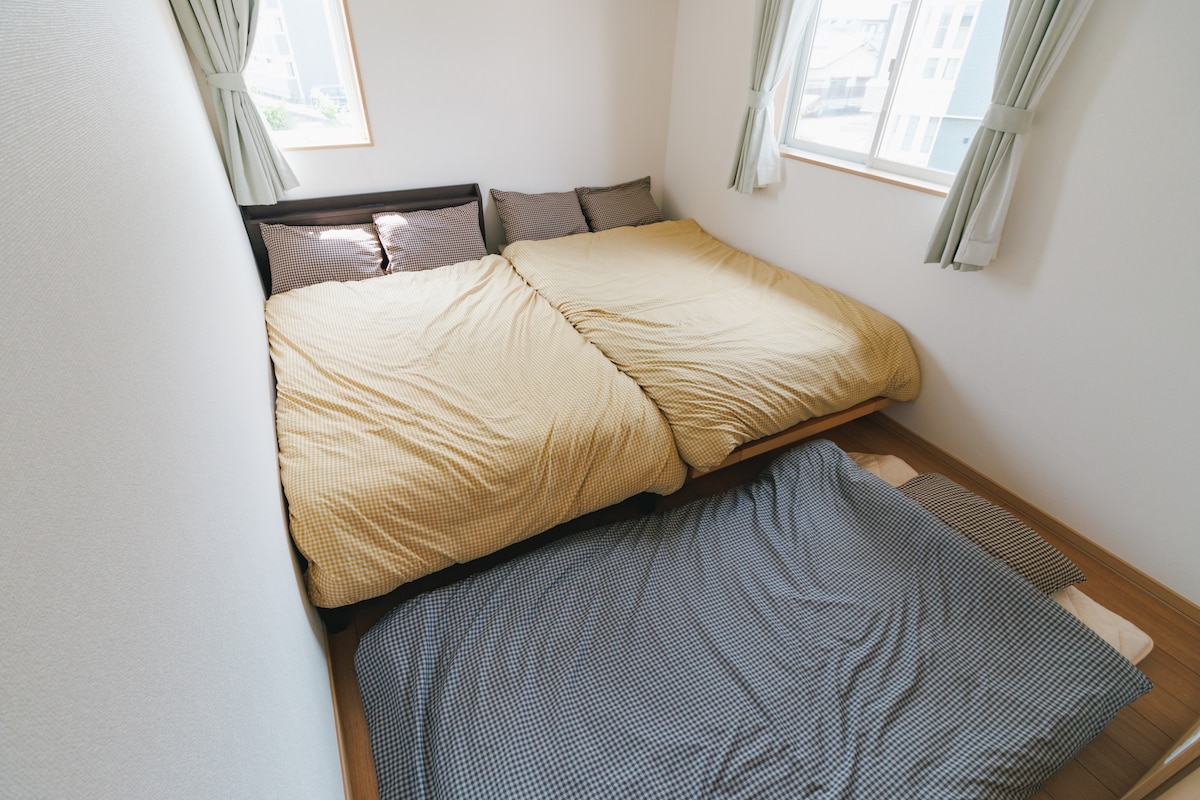 * Viktig Dette stedet har ingen parkeringsplass. Det er mange betalte parkeringsplasser i nærheten (24 timer: ca. 1000 yen). Perfekt for familie- og gruppebruk! Funksjoner i anlegget. ! Ubemannet betjening, smartlås installert, Ikke ansikt til ansikt inn- og utsjekk ! Privat bungalow på ca. 70 m ², kan brukes av opptil 8 personer (opptil 3 personer er den samme prisen) ! Utmerket transporttilgang, bussterminal, sentrumsområdet og Kumamoto slott, alt innenfor gangavstand. ! Bygningen ble bygget i 2018, rent vann, helt nytt utstyr ! Rent sengetøy rengjort av fagfolk - Fullt utstyrt, gratis trådløst nettverk, klimaanlegg, madrass med høy slitestyrke (tre dobbeltsenger, tre enkle madrasser). Slottbyen Kumamoto slott, en by med en rik historie og atmosfære, Shinmachi. Dette anlegget ligger to minutters gange fra trikkeholdeplassen "Shinmachi". Det er også nær Sakuramachi bussterminal og JR Kumamoto stasjon, noe som gjør det til en utmerket beliggenhet for transporttilgang. Du kan gå rundt og se hvert historiske sted, inkludert Kumamoto slott. Shimodori, det største sentrumsområdet i Kumamoto, ligger også innenfor gangavstand, så du vil ikke ha noen problemer med å spise eller handle. Du kan dra hjem med ro i sinnet, selv om du nyter lokal mat og lokal sake fullt ut.