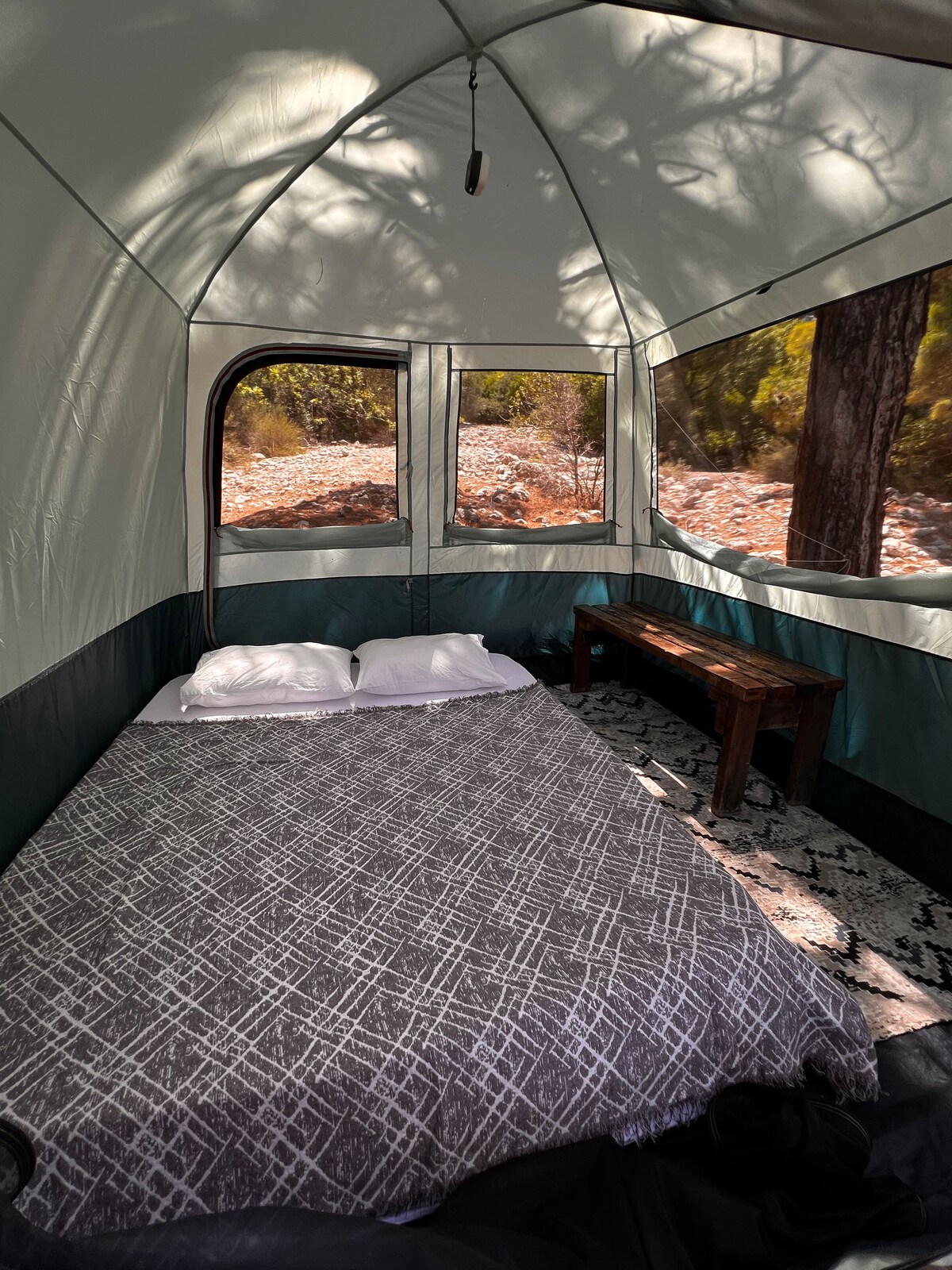 Teltet ditt er ved bassenget. En ekte naturopplevelse i skyggen av 300 år gamle trær. Stjernene følger deg om kvelden, og fuglene synger om morgenen. Føl deg som på Olympus i Tyrkias mest luksuriøse telt. Teltet vårt på 12 m2 har en vifte, 220 V strøm, en dobbeltseng på 150 x 200 og Pierre Cardin-sengetøy. Nyt et komfortabelt opphold i naturen. Ta med kofferten og kom!