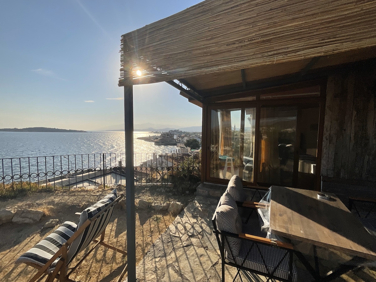 En minihytte med praktfull utsikt over landsbyen og dammen, hvor du kan nyte peisen om vinteren. 5 minutter til Ulamış sentrum. Alpehytte med flott beliggenhet 20 minutter fra kystlinjen,strandklubber som Seferihisar, Sığacık, Akarca (steder som kyststrand, mali-strand, Battery beach). Du kan smake på det berømte Karakılçık-hestebrødet som er bakt i steinovnen i landsbyen og Armola-osten, og du kan besøke landsbymarkedet vårt. Merk: Vi har to katter i hagen til huset vårt, som senere ble inkludert i huset vårt.