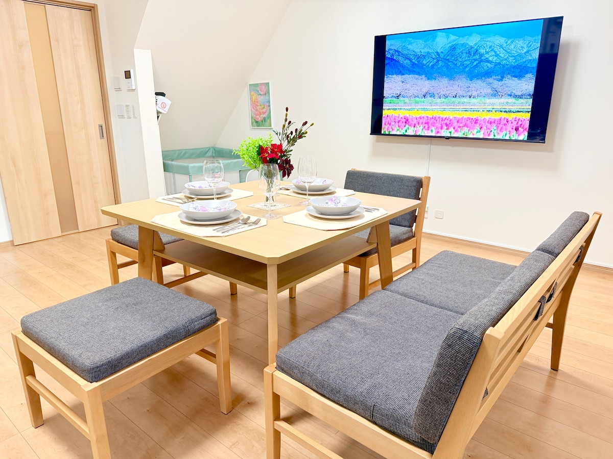 Skap minner med dette unike familievennlige hjemmet. På en klar dag er utsikten over Satoyama fra hagen veldig vakker. Alle rommene har Ghiblis verdensutsikt Den populære Ghibli-parken ligger veldig nærme (ti minutter med sykkel, 30 minutter til fots). Hele bygningen er privat. Små hunder (opptil 6 kg). Opptil to kjæledyr er tillatt i den store plenhagen. Store grupper er tilgjengelige (opptil 11 personer). Klimaanlegg i stuen og på soverommet i alle rom. Stor TV (60 tommer) Stort, fullt utstyrt kjøkken Fullt utstyrt med en overbygd grillplass i hagen (reservasjon kreves). Det er en ColeManga-grill.Bruksgebyret er 5 000 yen. Gratis parkering for inntil 3 biler på stedet. Raskt trådløst nettverk er tilgjengelig. ・ Vi har ni elektriske sykler tilgjengelig (1000 yen per dag, reservasjoner er nødvendig da de deles av tre hus). Bordtennis er tilgjengelig.Det er et ekte bordtennisbord (gratis). - Fasiliteter · Aircondition i alle rom · Kjøleskap · Gass tørketrommel · Vaskemaskin · Mikrobølgeovn · Washlet · Riskoker · Vannkoker · Hårføner · Kokeplate Ovnkassettovn · Glass · Servise · Trådløs støvsuger