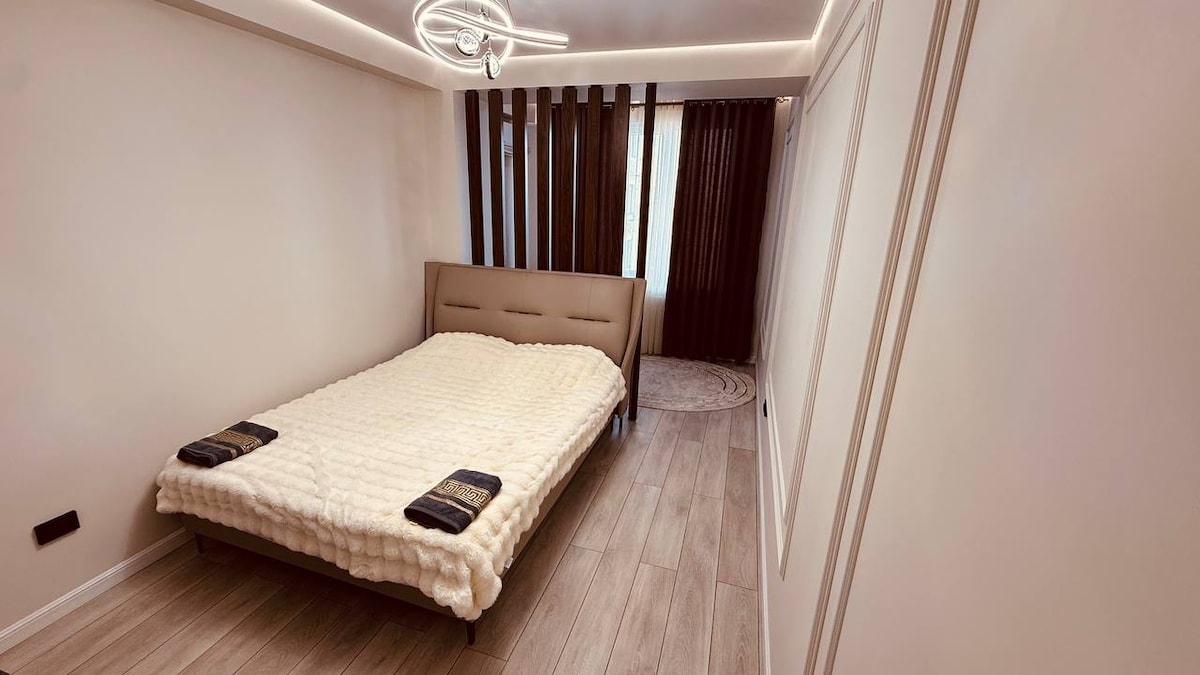 Den mest fantastiske og koselige leiligheten i sentrum. Ved siden av Kirgisistans nasjonale filharmoni. Veldig nær det sentrale torget og regjeringshuset. En vakker og rolig boulevard for spaserturer, kaffebarer, leilighet etter renovering. En veldig vakker utsikt over byen og fjellene. Det er WiFi. Det ER INSTALLERT KLIMAANLEGG i alle rom!!!Overvåking av alle forhold. Huset har et tehus-kafe av nasjonalt kjøkken. Et hus med sikkerhet, videoovervåkning, en lekeplass!