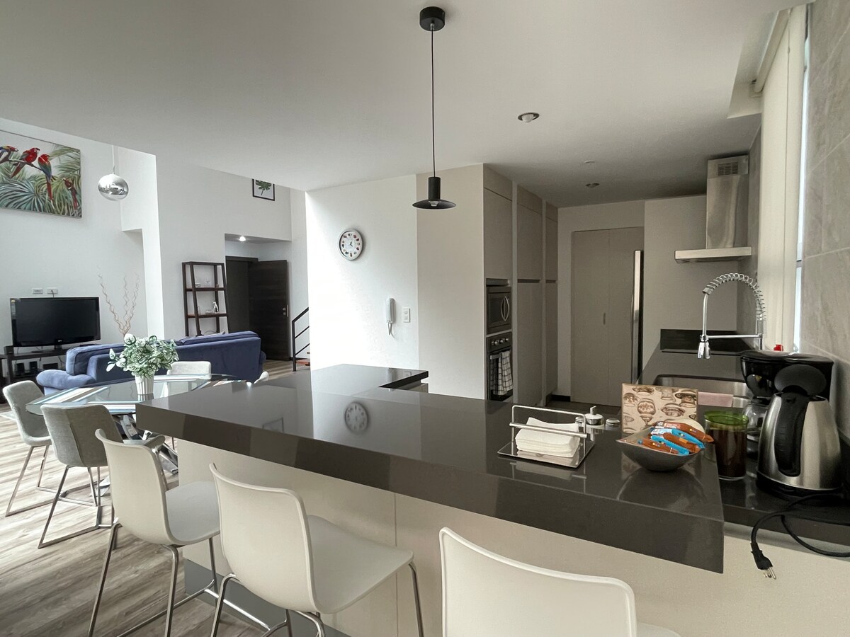 Moderne loftsleilighet i 21. etasje, ny bygning med autonom lysgenerator, ideell for forretningsreise eller for en spesiell anledning, unik utsikt over byen. Privilegert beliggenhet i det nordlige sentrum av Quito ved siden av La Carolina-parken, i tillegg finner du kjøpesentre og finansinstitusjoner bare noen få skritt unna. Tjenesten inkluderer parkering, wifi, hjemmekino, badekar, varmt vann, felles vaskemaskin/tørketrommel, hygieneartikler, treningsstudio og svømmebasseng.