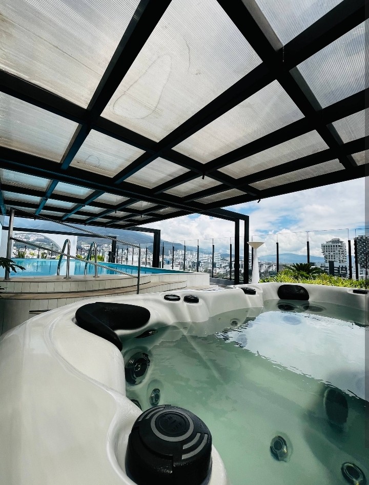 EDGE TOWER-bygningen, 15. etasje Nyt en luksuriøs opplevelse i en av de mest eksklusive bygningene i Quito. Denne elegante leiligheten ligger på høye etasjer, og tilbyr en spektakulær utsikt over byen, en uslåelig beliggenhet og en høy servicestandard. For lengre opphold inkluderer vi en profesjonell rengjøringstjeneste uten ekstra kostnad, og vi garanterer alltid din komfort og velvære. *spaområdet er deaktivert for grundig vedlikehold*