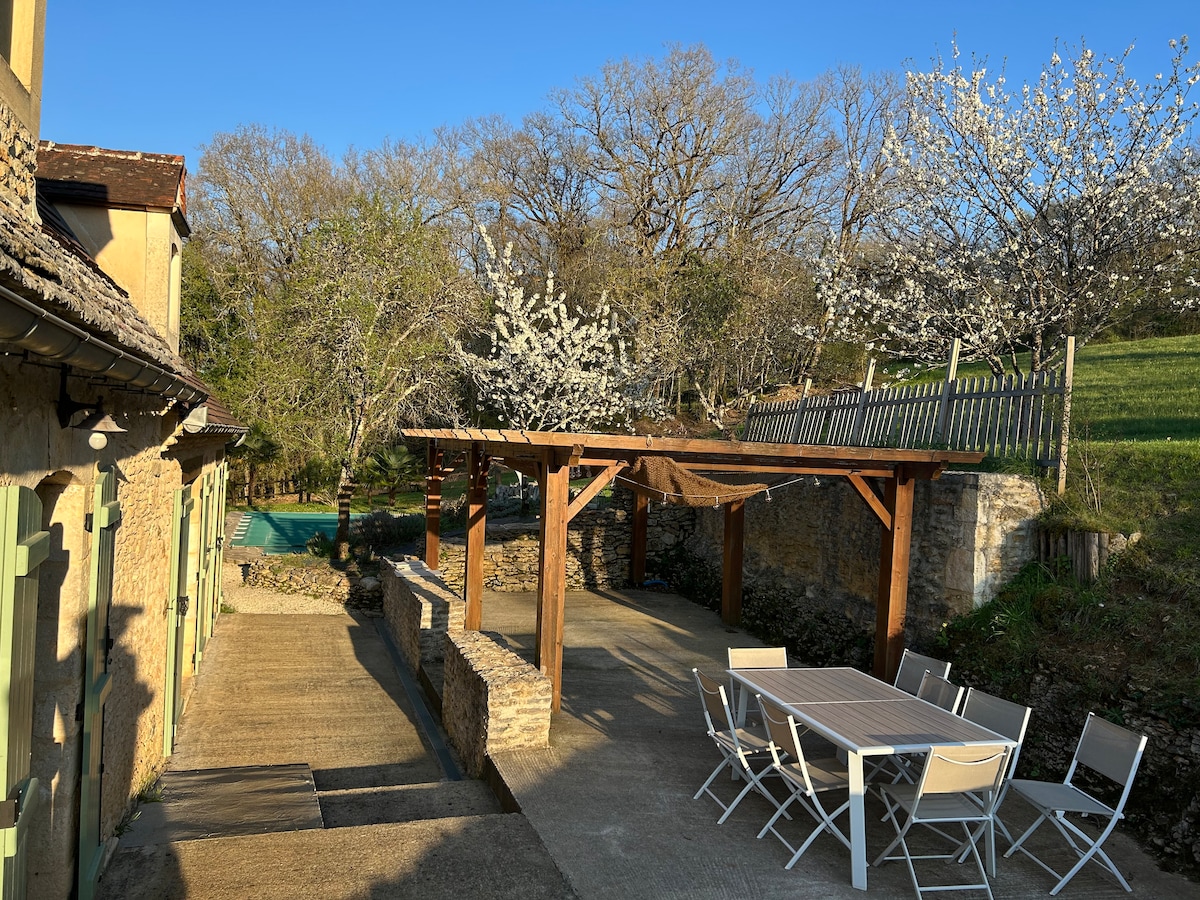 En Dordogne, au cœur du Périgord Noir : Maison en pierre rénovée en 2021, terrasse bois avec pergola, jardin non clos et piscine privative au sel, ouverte mais NON chauffée en AVRIL, chauffée à 26° minimun de mai à fin septembre uniquement, climatisation, parking privatif. Tout le mobilier est récent. Situation idéale pour rayonner en Périgord. Arrivée tardive possible.