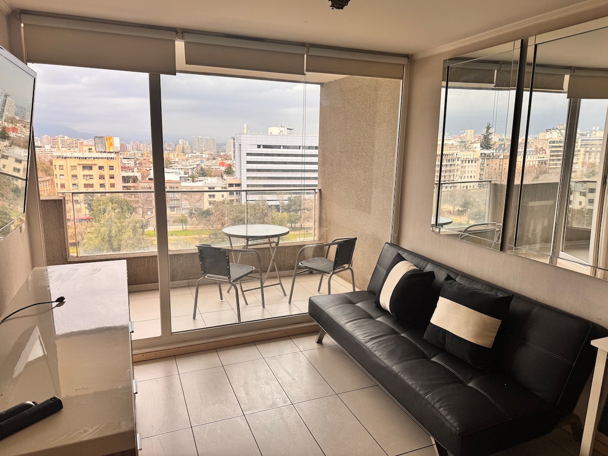 Moderne leilighet i Bellavista/Providencia, bare noen skritt fra Metro Salvador. Perfekt for par eller forretningsreisende. Nyt ultrarask trådløst nettverk (561 Mbps), et lyst soverom med dobbeltseng, et fullt utstyrt kjøkken, en koselig stue og en privat balkong med utsikt over grøntområder. Bygningen har et vaskerom, heis og døgnåpen vakthold. Utmerket beliggenhet nær San Cristóbal Hill, Patio Bellavista og restauranter.
